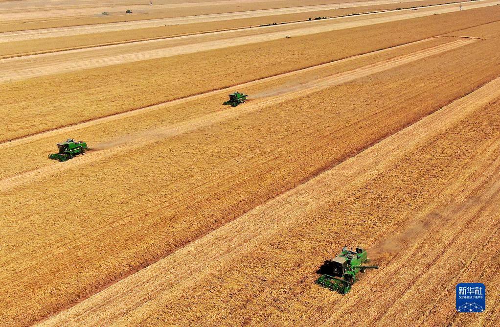 在河南省黃泛區(qū)農場九分場的麥田里,農機手操作收割機收獲小麥(無人機照片,2021年6月6日攝)。新華社記者李安攝