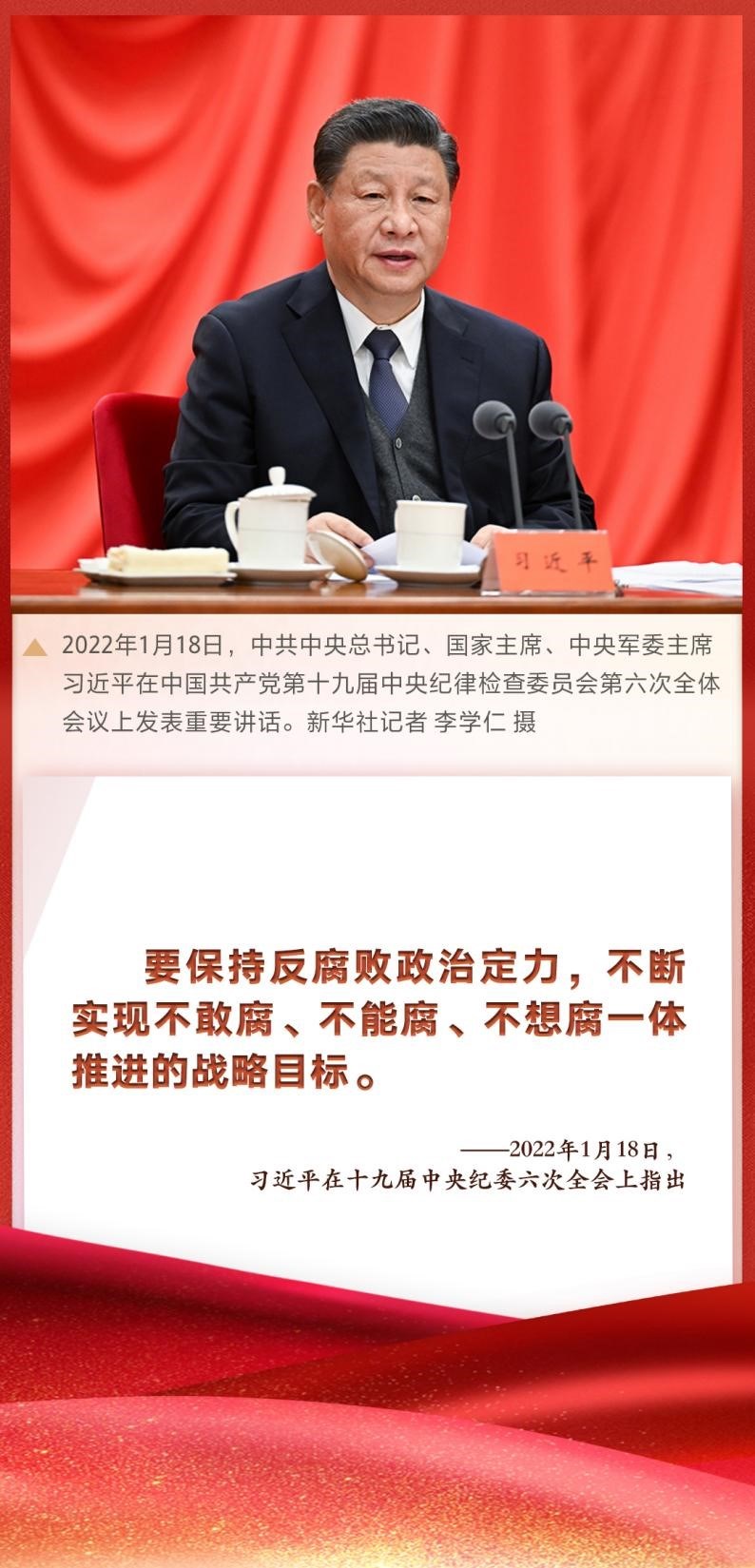“要保持反腐敗政治定力,不斷實(shí)現(xiàn)不敢腐、不能腐、不想腐一體推進(jìn)的戰(zhàn)略目標(biāo)?!敝泄仓醒肟倳?、國家主席、中央軍委主席習(xí)近平在十九屆中央紀(jì)委六次全會上發(fā)表重要講話,深刻總結(jié)新時(shí)代黨的自我革命的成功實(shí)踐,深刻闡述全面從嚴(yán)治黨取得的歷史性、開創(chuàng)性成就,產(chǎn)生的全方位、深層次影響,對堅(jiān)持不懈把全面從嚴(yán)治黨向縱深推進(jìn)、迎接黨的二十大勝利召開作出戰(zhàn)略部署。