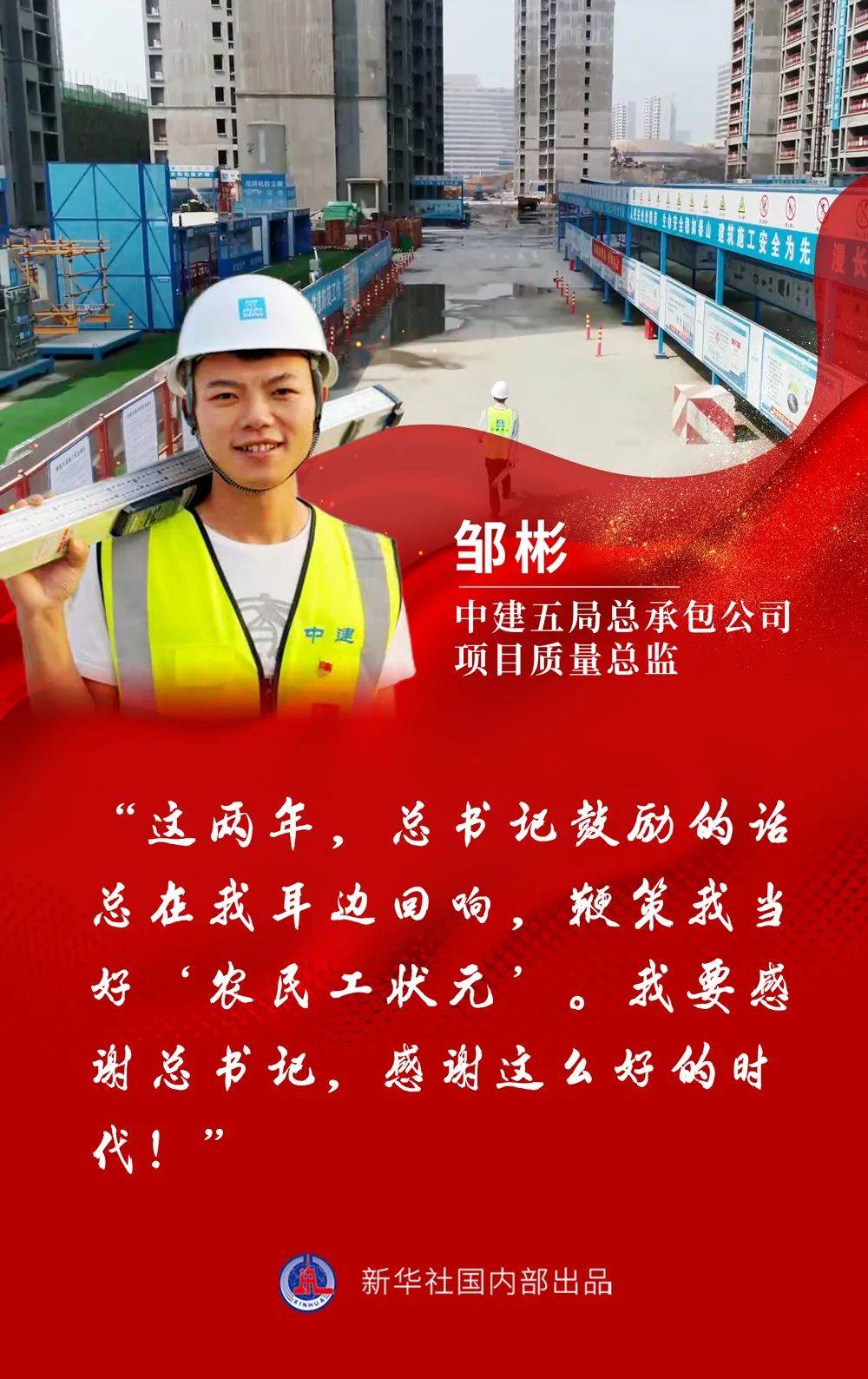 “這兩年,總書記鼓勵的話總在我耳邊回響,鞭策我當(dāng)好‘農(nóng)民工狀元’。我要感謝總書記,感謝這么好的時代!”鄒彬臉上洋溢著青春的光芒。