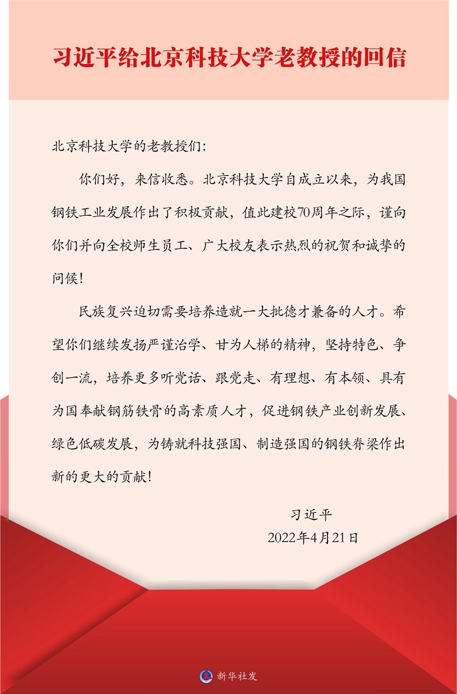中共中央總書(shū)記、國(guó)家主席、中央軍委主席習(xí)近平4月21日給北京科技大學(xué)的老教授回信,對(duì)培養(yǎng)更多高素質(zhì)人才,促進(jìn)鋼鐵產(chǎn)業(yè)創(chuàng)新發(fā)展、綠色低碳發(fā)展提出殷切期望。