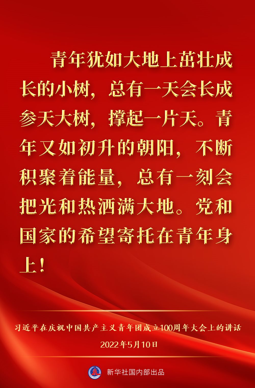 5月10日上午,中共中央總書記、國家主席、中央軍委主席習(xí)近平出席慶祝中國共產(chǎn)主義青年團成立100周年大會并發(fā)表重要講話,一起來看金句。