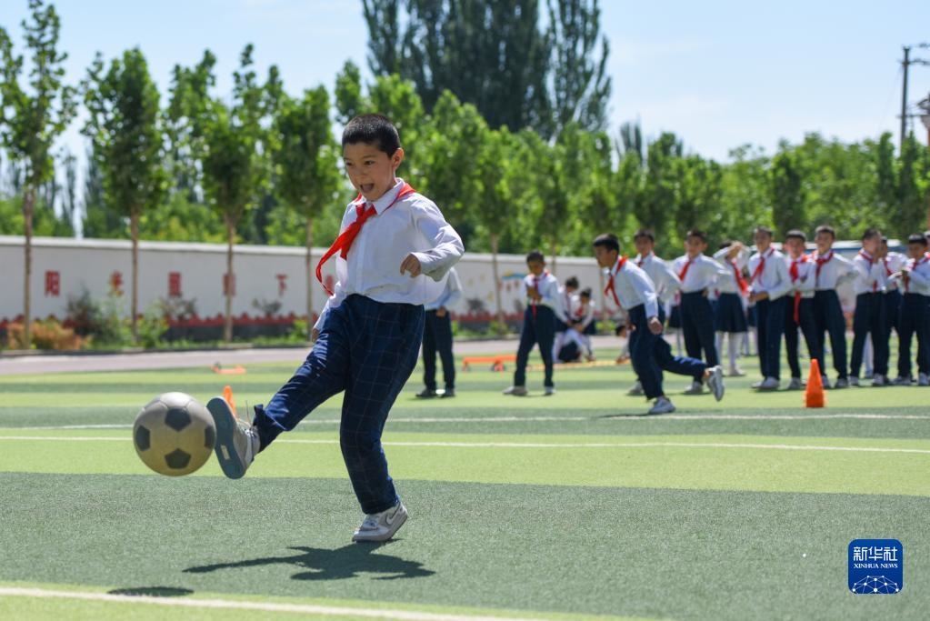 在新疆喀什地區(qū)疏附縣托克扎克鎮(zhèn)中心小學,學生們在上體育課(2022年6月10日攝)。新華社記者 丁磊 攝