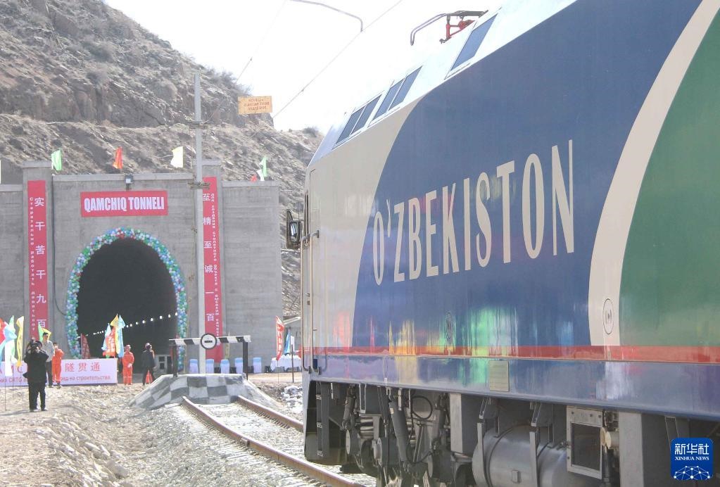 2016年2月27日,烏茲別克斯坦安格連-帕普鐵路卡姆奇克隧道全隧貫通。這是一列專列停在隧道進口。新華社記者 沙達提 攝
