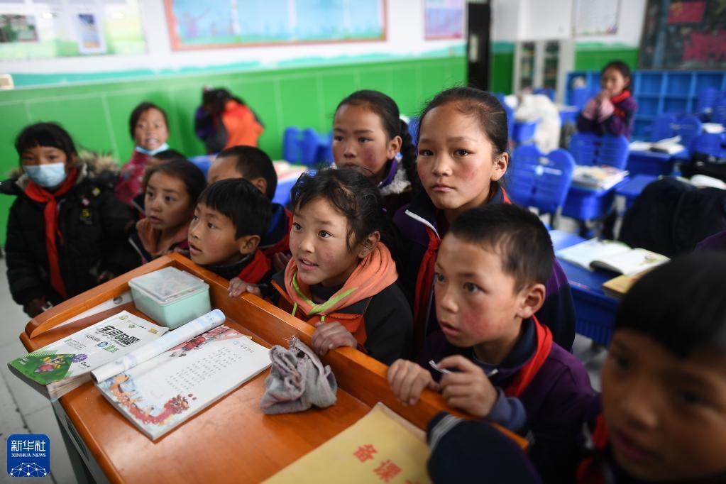 青海省果洛藏族自治州瑪多縣民族寄宿制中學(xué)二年級的學(xué)生在課間觀看多媒體課件(2021年3月26日攝)。該校采用清潔取暖方式后,學(xué)生的學(xué)習(xí)和生活環(huán)境大為改善。新華社記者 張宏祥 攝