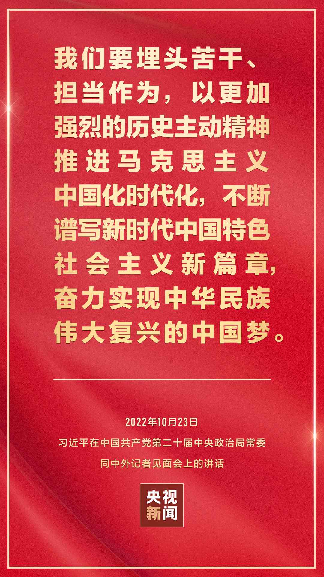 在中國共產黨第二十屆中央委員會第一次全體會議上當選的中共中央總書記習近平和中共中央政治局常委李強、趙樂際、王滬寧、蔡奇、丁薛祥、李希,23日中午在人民大會堂同采訪中共二十大的中外記者見面。習近平發(fā)表重要講話。