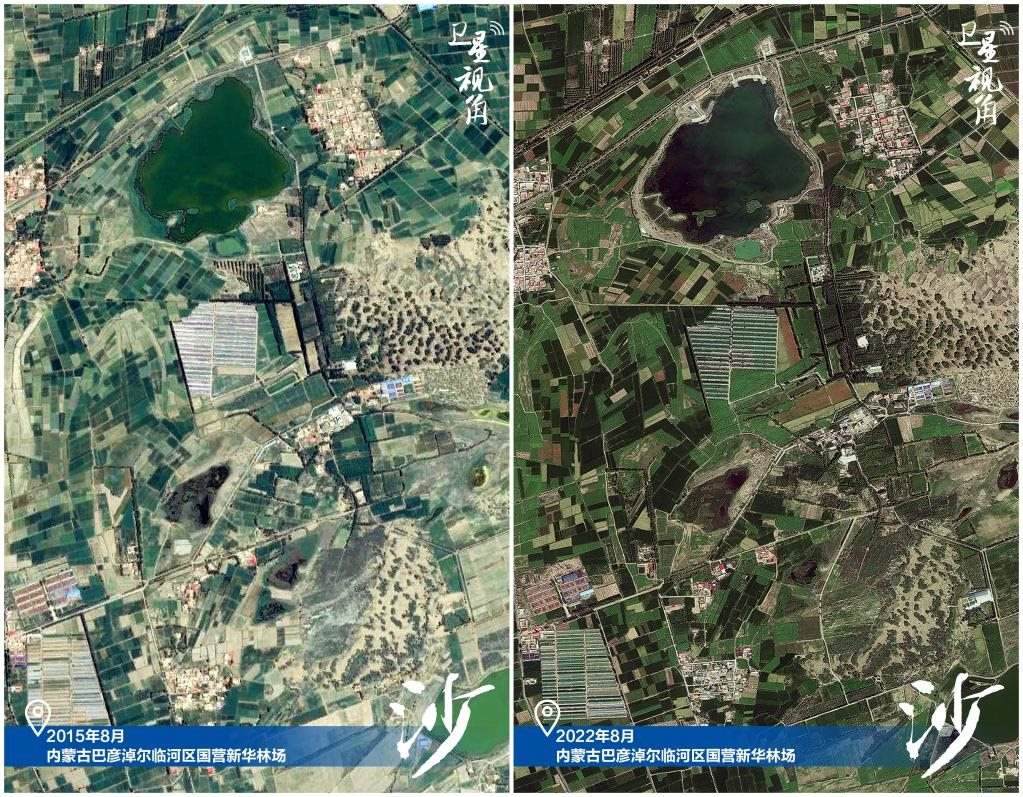 ↑2022年跟2015年相比,從衛(wèi)星圖上下部分看青海湖水體面積擴大。