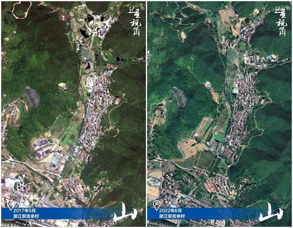 ↑2022年跟2017年相比,余村山體植被更豐富,鄉(xiāng)村環(huán)境更宜居。
