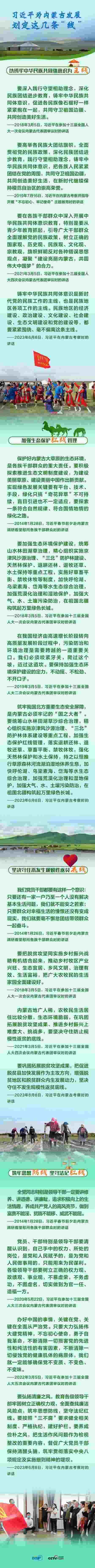 6月8日,習近平總書記聽取內(nèi)蒙古自治區(qū)黨委和政府工作匯報后發(fā)表講話,強調(diào)內(nèi)蒙古要“以鑄牢中華民族共同體意識為主線”,“加強生態(tài)保護紅線管理”,“堅決守住不發(fā)生規(guī)模性返貧底線”,“筑牢思想防線,堅守法紀紅線”。