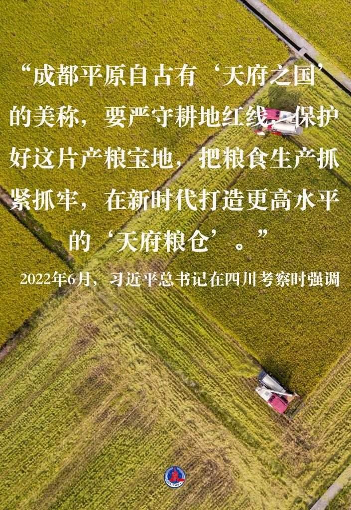 2022年6月,習(xí)近平總書(shū)記在四川考察時(shí)強(qiáng)調(diào),“成都平原自古有‘天府之國(guó)’的美稱,要嚴(yán)守耕地紅線,保護(hù)好這片產(chǎn)糧寶地,把糧食生產(chǎn)抓緊抓牢,在新時(shí)代打造更高水平的‘天府糧倉(cāng)’”。