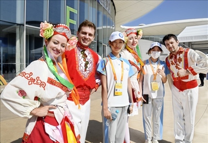 △6月15日,來自白俄羅斯的演員在表演結(jié)束后與志愿者合影。當(dāng)日,上海合作組織產(chǎn)業(yè)鏈供應(yīng)鏈論壇暨2023上合國際投資貿(mào)易博覽會在青島開幕。