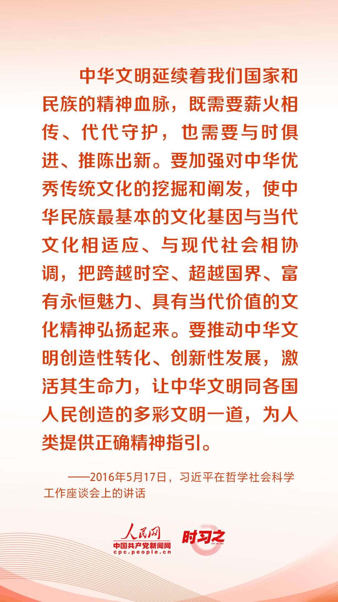 “每一種文明都延續(xù)著一個國家和民族的精神血脈,既需要薪火相傳、代代守護(hù),更需要與時俱進(jìn)、勇于創(chuàng)新?!秉h的十八大以來,習(xí)近平總書記深刻把握新時代歷史方位,以堅(jiān)定的文化自覺、宏闊的歷史視野、深遠(yuǎn)的戰(zhàn)略考量,就文化建設(shè)提出了一系列新理念新思想新戰(zhàn)略,引領(lǐng)中華文化創(chuàng)造性轉(zhuǎn)化、創(chuàng)新性發(fā)展,推動中華文脈綿延繁盛、中華文明歷久彌新。