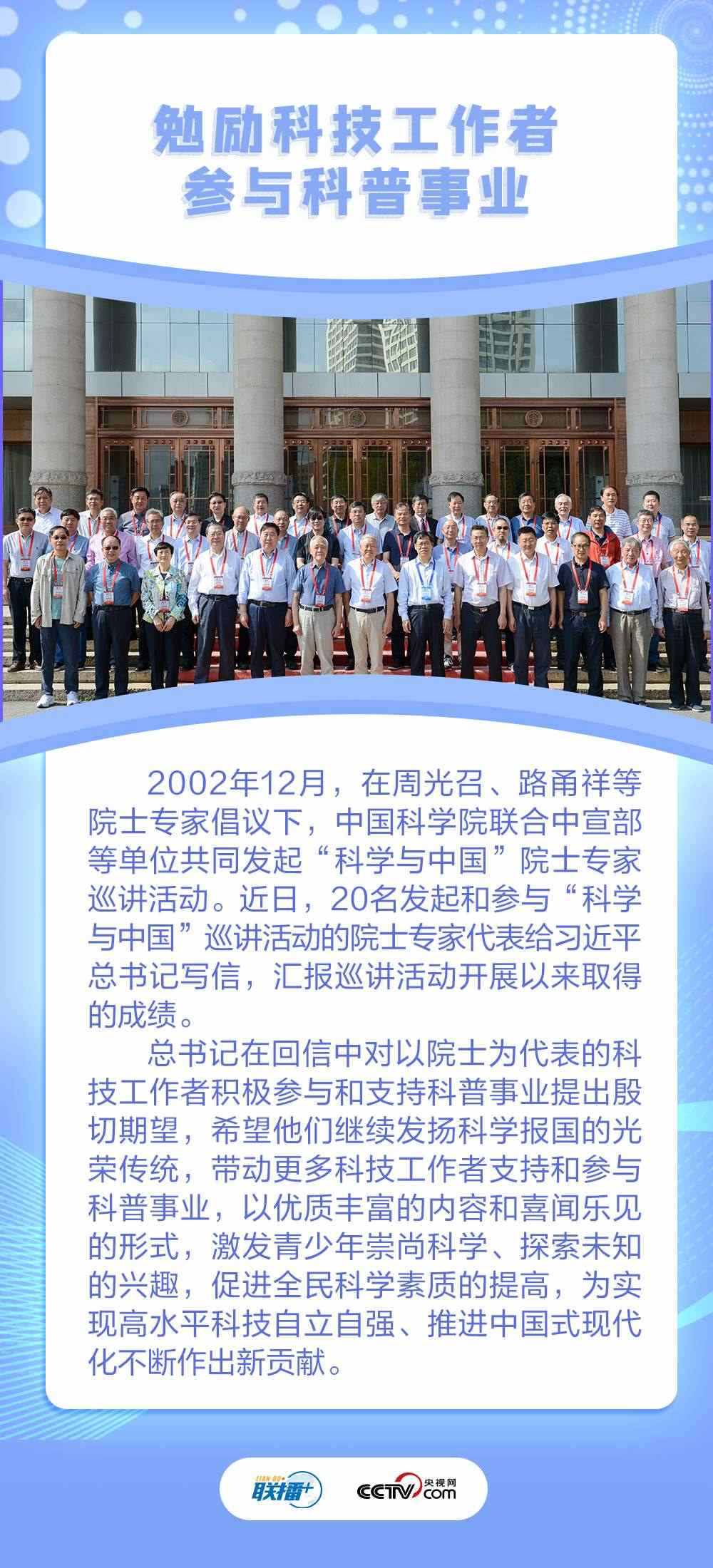 7月20日,習(xí)近平總書記給“科學(xué)與中國(guó)”院士專家代表回信。他在回信中強(qiáng)調(diào),科學(xué)普及是實(shí)現(xiàn)創(chuàng)新發(fā)展的重要基礎(chǔ)性工作,并對(duì)科技工作者支持和參與科普事業(yè)提出殷切期望。