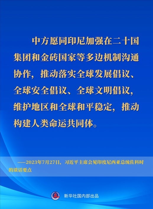 7月27日下午,國家主席習(xí)近平在成都會(huì)見來華出席第31屆世界大學(xué)生夏季運(yùn)動(dòng)會(huì)開幕式并訪華的印度尼西亞總統(tǒng)佐科。一起來看習(xí)近平主席在會(huì)見時(shí)的談話要點(diǎn)↓
