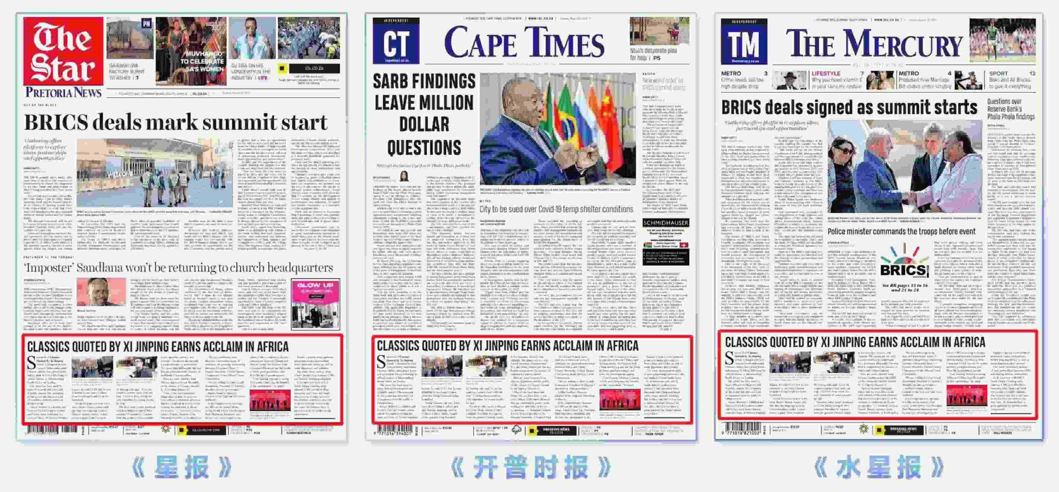 8月22日出版的南非三大主流報刊南非《星報》、《開普時報》、《水星報》,連續(xù)第二天在頭版顯著位置發(fā)表文章。文章指出,《平“語”近人——習(xí)近平喜歡的典故》第二季周日(8月20日)在南非約翰內(nèi)斯堡正式發(fā)布后,在非洲贏得了廣泛好評。系列節(jié)目已經(jīng)在多家非洲廣播公司播出,并在公共場所大屏幕展示,這些語錄吸引了大量非洲受眾觀看并獲得積極反響。