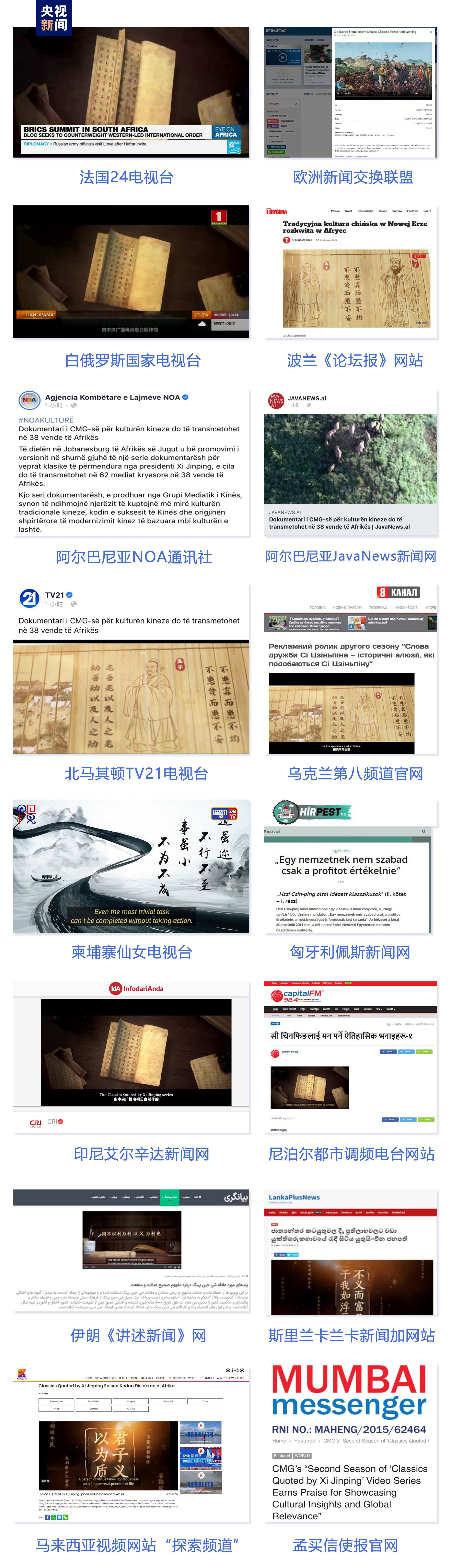 法國24電視臺、歐洲新聞交換聯(lián)盟、白俄羅斯國家電視臺、波蘭《論壇報》網(wǎng)站、阿爾巴尼亞NOA通訊社、北馬其頓TV21電視臺、烏克蘭第八頻道官網(wǎng)、匈牙利佩斯新聞網(wǎng)、柬埔寨東盟頭條新聞社、緬甸仰光傳媒、印尼艾爾辛達新聞網(wǎng)、尼泊爾都市調(diào)頻電臺網(wǎng)站等102家海外主流媒體紛紛轉(zhuǎn)播轉(zhuǎn)載《平“語”近人——習(xí)近平喜歡的典故》第二季多語種版本。