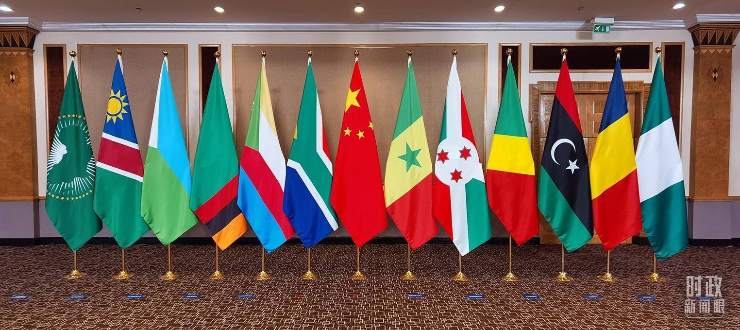 △中非領(lǐng)導(dǎo)人對話會會場擺放的與會各方旗幟。(總臺央視記者郭鴻拍攝)
