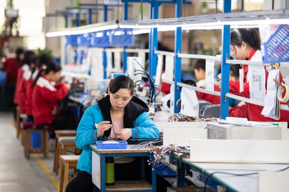 在湖南省汨羅市神鼎山鎮(zhèn)豐倉村的“巾幗車間”,工人在生產(chǎn)數(shù)據(jù)線(2023年3月7日攝)。新華社記者 陳思汗 攝