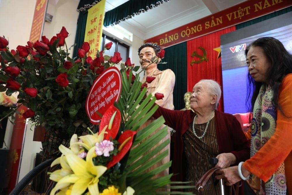 2018年9月30日,在越南河內(nèi)市嘉林縣驕騎鄉(xiāng),洪水將軍親屬向其雕像獻花。新華社記者王迪攝