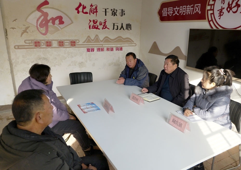 在寶豐縣鬧店鎮(zhèn)范營村“擺理堂”,村鎮(zhèn)干部(右)為村民進行信訪調(diào)解(2023年12月20日攝)。河南省寶豐縣積極推進四下基層工作深入開展,已打造鬧店鎮(zhèn)范營村“擺理堂”、石橋鎮(zhèn)東大莊村“老娘舅茶室”等系列鄉(xiāng)村社區(qū)服務陣地,協(xié)調(diào)鄰里關(guān)系,有效化解各類矛盾,同時不斷豐富工作內(nèi)容,拓展服務功能,助力鄉(xiāng)村振興。新華社記者 李嘉南 攝