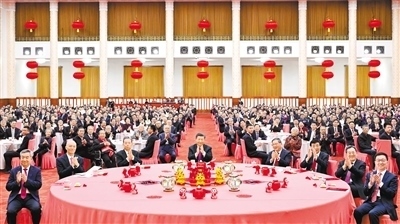 人民大會(huì)堂宴會(huì)廳燈光璀璨、喜氣洋洋,各界人士齊聚一堂、共迎新春,現(xiàn)場(chǎng)洋溢著歡樂祥和的節(jié)日氣氛。