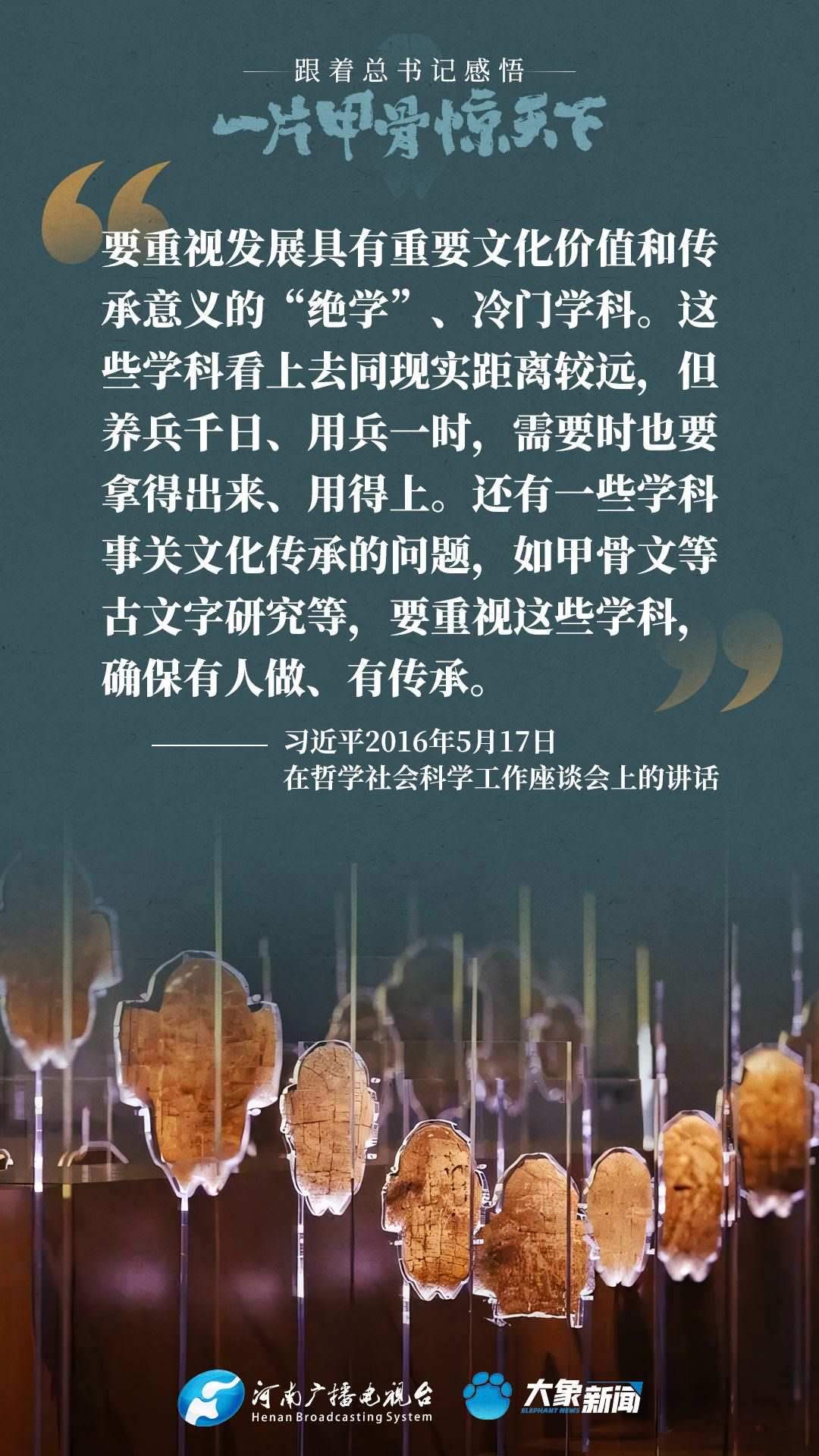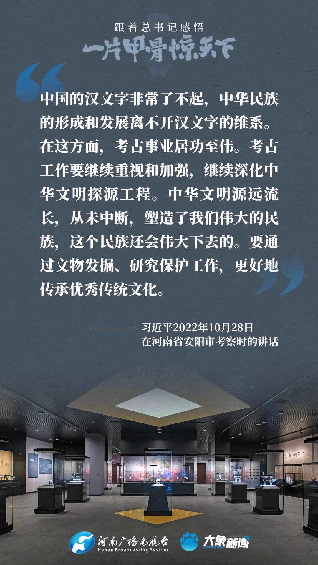 黨的十八大以來(lái),習(xí)近平總書(shū)記多次就殷墟和甲骨文保護(hù)研究利用工作作出重要講話(huà)重要指示,為我們堅(jiān)定文化自信,傳承發(fā)展中華優(yōu)秀傳統(tǒng)文化提供了根本遵循。大象新聞邀您一起回顧、學(xué)習(xí)。