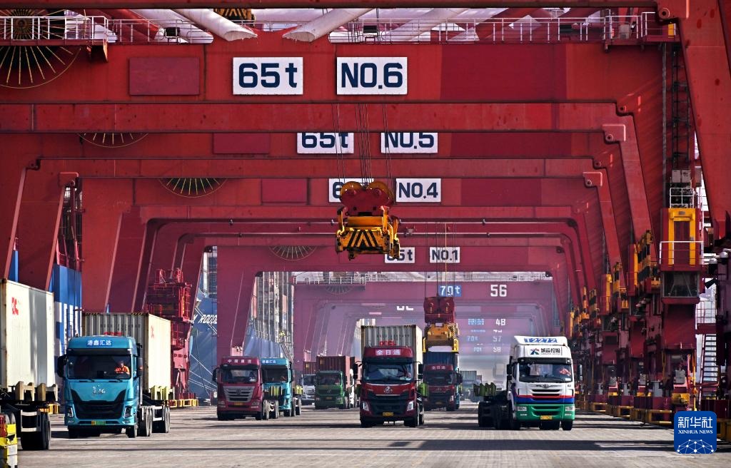 ??2024年2月11日,卡車(chē)在青島港集裝箱碼頭裝運(yùn)集裝箱。新華社記者 李紫恒 攝
