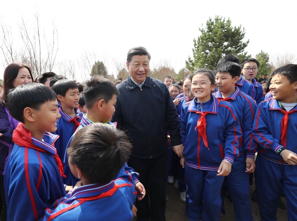 2019年4月8日,習近平等黨和國家領(lǐng)導人來到北京市通州區(qū)永順鎮(zhèn)參加首都義務植樹活動。這是習近平同少先隊員在一起。