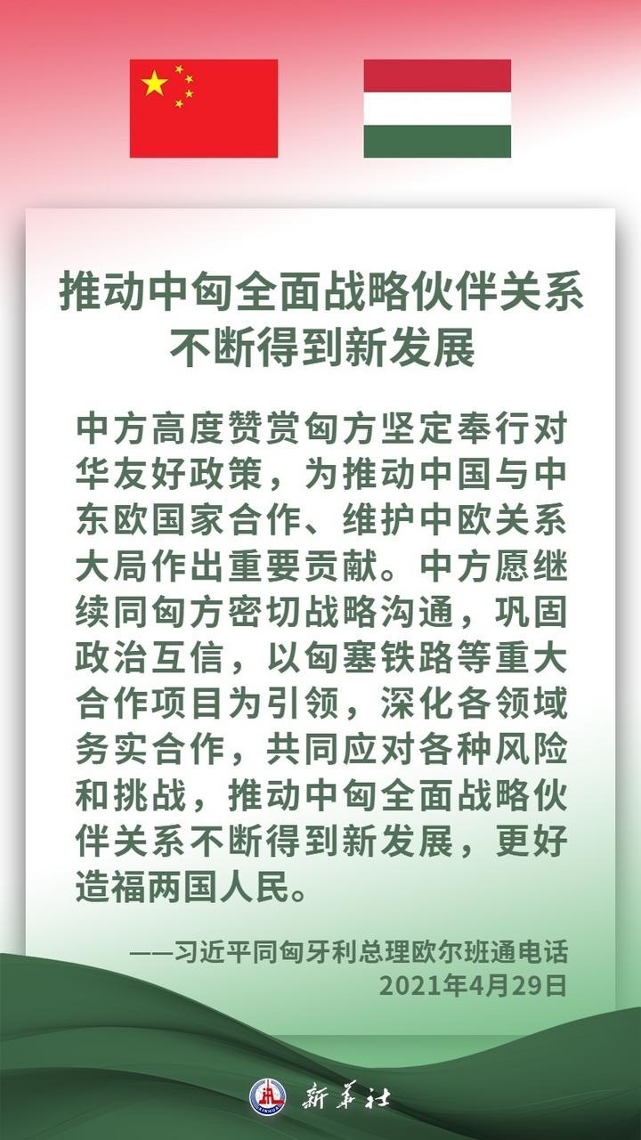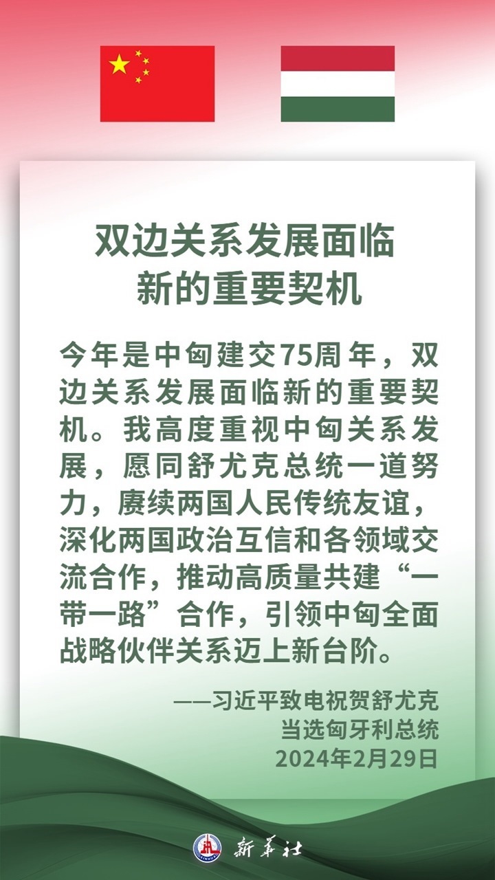 匈牙利是中東歐地區(qū)重要國家,是中方推進(jìn)共建“一帶一路”及中國-中東歐國家合作的重要合作伙伴。近年來,在兩國領(lǐng)導(dǎo)人的戰(zhàn)略引領(lǐng)下,中匈關(guān)系保持高水平發(fā)展,兩國高層交往密切,政治互信持續(xù)深化,各領(lǐng)域合作扎實推進(jìn)、成果豐碩,為兩國人民帶來切實利益。習(xí)近平主席說,中方愿同匈方繼續(xù)做彼此信賴、合作共贏的好朋友、好伙伴。