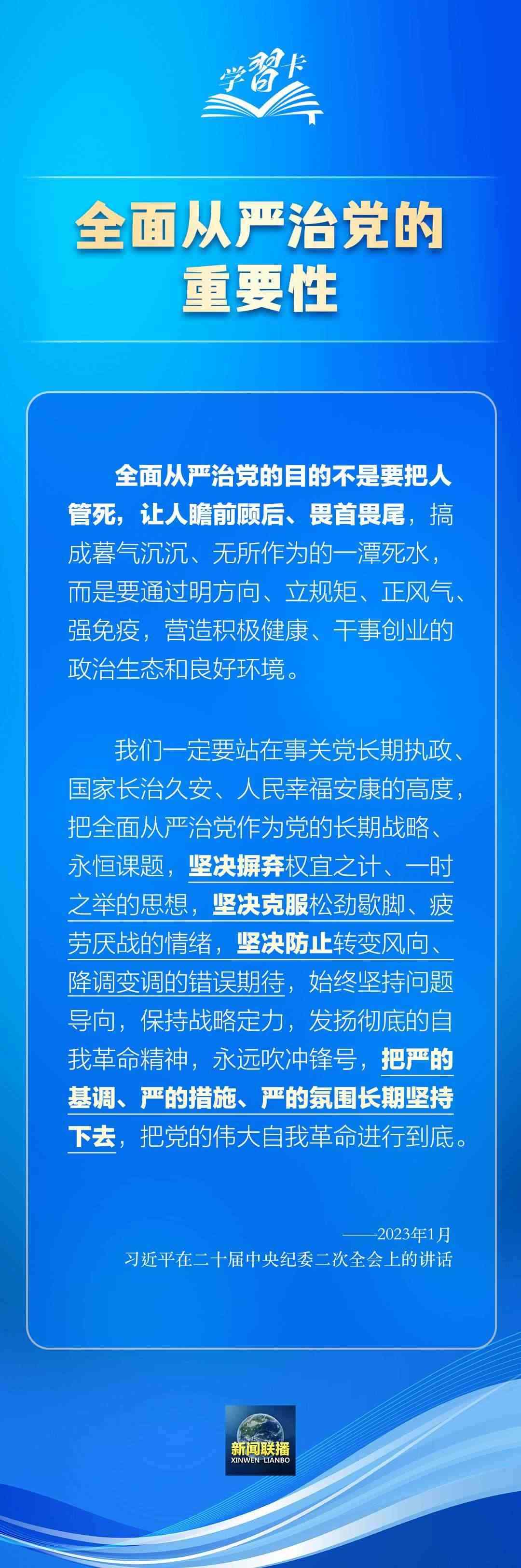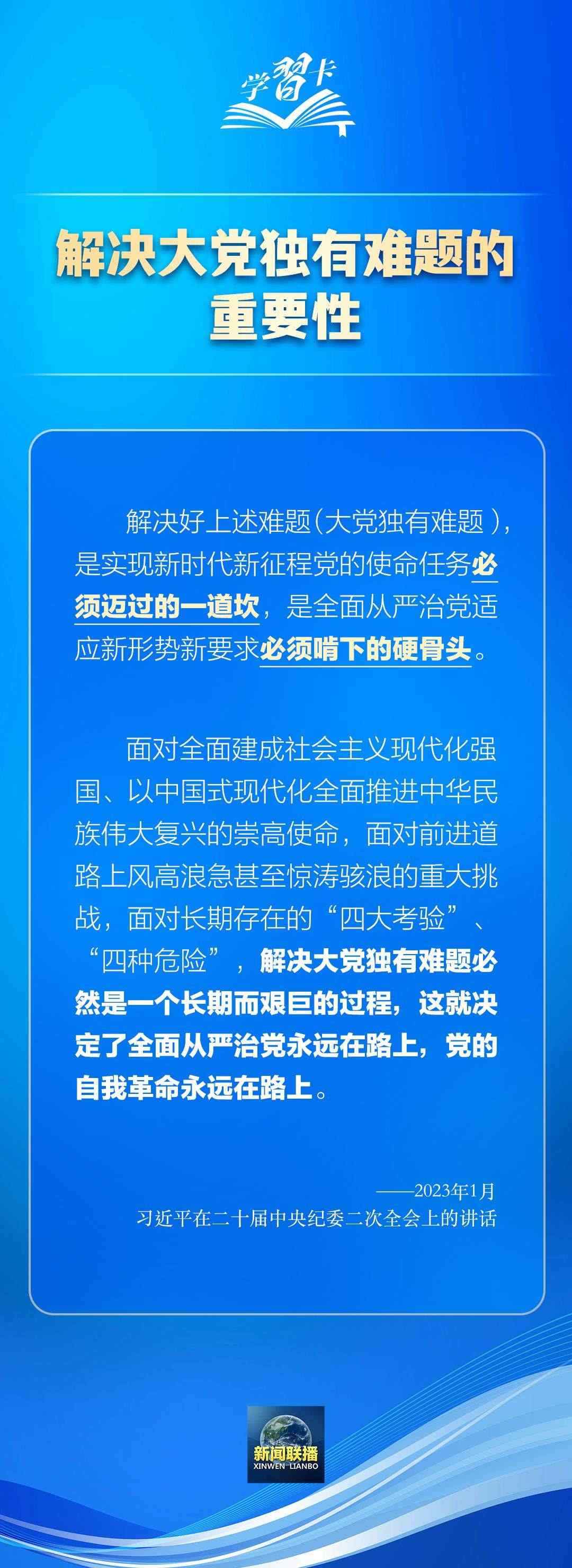 習近平總書記在不同場合多次強調(diào)全面從嚴治黨、黨的自我革命的重要性。解決好大黨獨有難題,是實現(xiàn)新時代新征程黨的使命任務(wù)必須邁過的一道坎,是全面從嚴治黨適應(yīng)新形勢新要求必須啃下的硬骨頭。