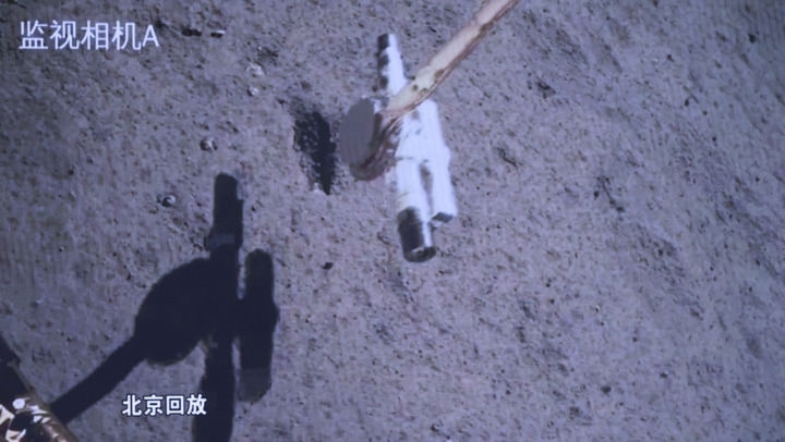 這是2020年12月4日,國(guó)家航天局公布的探月工程嫦娥五號(hào)探測(cè)器在月球表面展示國(guó)旗的照片。嫦娥五號(hào)著陸器和上升器組合體全景相機(jī)環(huán)拍成像,五星紅旗在月面成功展開(kāi),此外圖像上方可見(jiàn)已完成表取采樣的機(jī)械臂及采樣器。新華社發(fā)(國(guó)家航天局供圖)