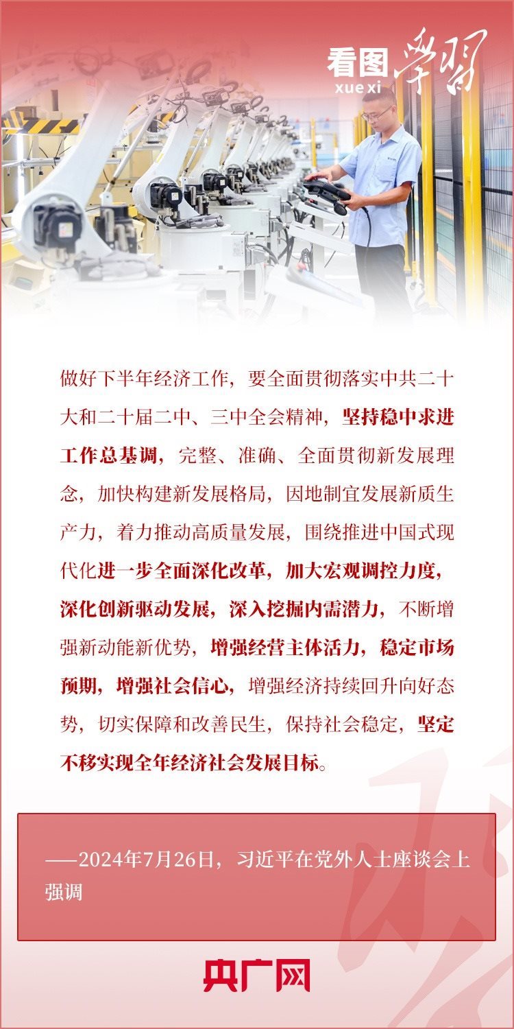中共中央7月26日在中南海召開黨外人士座談會(huì),就當(dāng)前經(jīng)濟(jì)形勢(shì)和下半年經(jīng)濟(jì)工作聽取各民主黨派中央、全國工商聯(lián)負(fù)責(zé)人和無黨派人士代表的意見和建議。習(xí)近平總書記主持座談會(huì)并發(fā)表重要講話,對(duì)做好下半年經(jīng)濟(jì)工作作出重要部署,并對(duì)黨外人士提出3點(diǎn)希望。一起來學(xué)習(xí)!