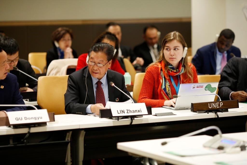 2019年4月18日,在位于紐約的聯(lián)合國總部,林占熺(前排中)在“菌草技術(shù):‘一帶一路’倡議對(duì)促進(jìn)落實(shí)聯(lián)合國2030年可持續(xù)發(fā)展議程的實(shí)質(zhì)性貢獻(xiàn)”專題研討會(huì)上發(fā)言。新華社記者 李木子 攝