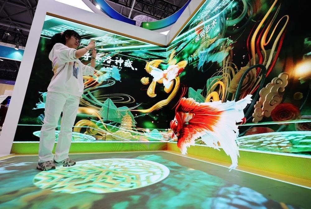 2024年4月1日,在安徽合肥舉辦的2024國際顯示技術(shù)大會(huì)上,一名觀眾體驗(yàn)京東方展出的裸眼3D快速拆裝折角屏。