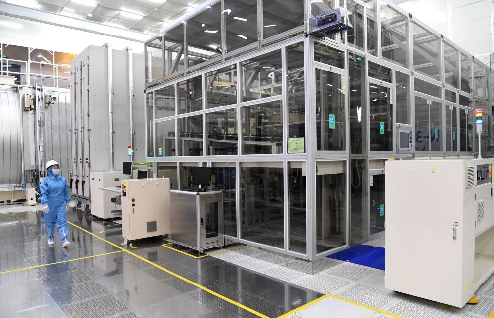 2022年7月28日,安徽合肥京東方顯示技術(shù)有限公司的工作人員在10.5代生產(chǎn)線上作業(yè)。