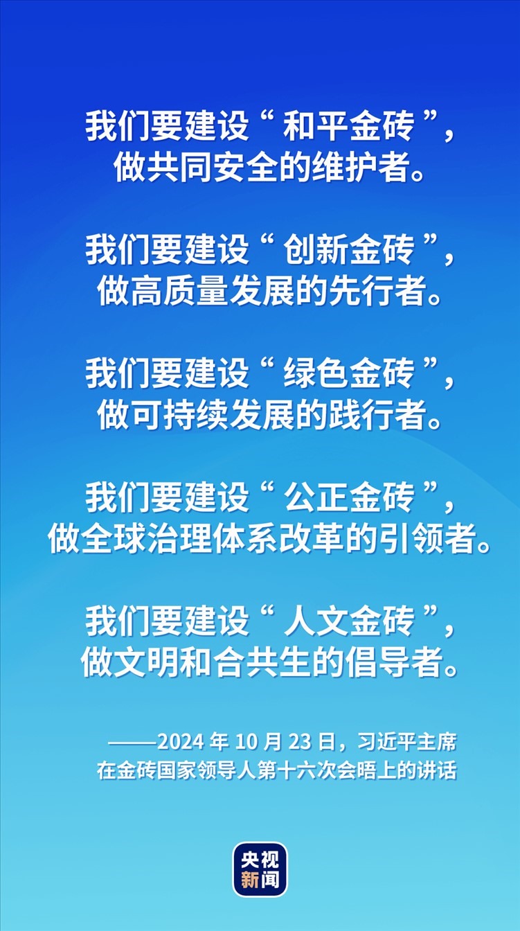 對于如何推動“大金磚合作”高質(zhì)量發(fā)展,習(xí)近平主席提出五點(diǎn)建議——建設(shè)“和平金磚”“創(chuàng)新金磚”“綠色金磚”“公正金磚”“人文金磚”,攜手更多“全球南方”國家共同推動構(gòu)建人類命運(yùn)共同體。