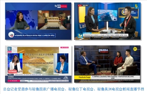中央廣播電視總臺記者受邀參與秘魯國家廣播電視臺、秘魯拉丁電視臺和當(dāng)?shù)厥找暵首罡叩拿佤斆乐揠娨暸_新聞直播節(jié)目,介紹《平“語”近人——習(xí)近平喜歡的典故》第三季(西班牙語版)內(nèi)容,帶領(lǐng)當(dāng)?shù)厥鼙姼形蛄?xí)近平主席用典中蘊含的中國智慧。