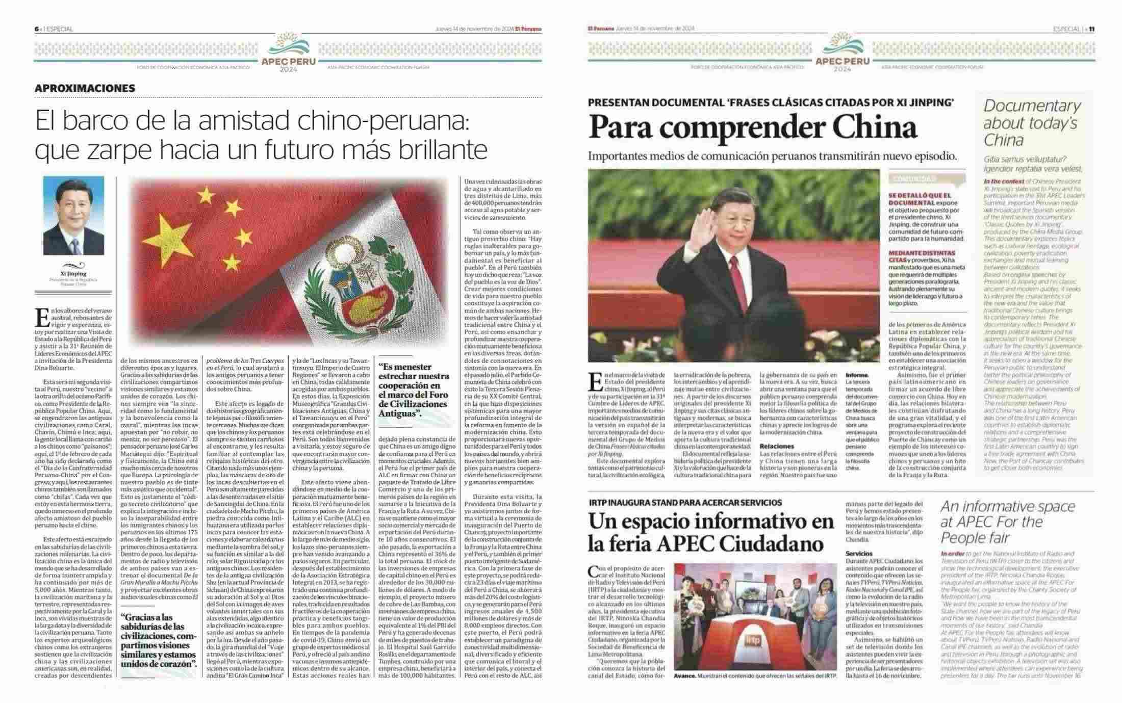 在中國國家主席習(xí)近平應(yīng)秘魯共和國總統(tǒng)博魯阿爾特邀請,赴利馬出席亞太經(jīng)合組織第三十一次領(lǐng)導(dǎo)人非正式會議并對秘魯進行國事訪問之際,由中國中央廣播電視總臺制作的《平“語”近人——習(xí)近平喜歡的典故》第三季(西班牙語版),將于當(dāng)?shù)貢r間11月14日起在秘魯國家廣播電視臺、秘魯電視聯(lián)播網(wǎng)、秘魯廣播節(jié)目集團電視端等多平臺落地播出。當(dāng)?shù)囟嗉抑髁髅襟w對節(jié)目落播進行預(yù)告,引發(fā)秘魯各界普遍期待和廣泛關(guān)注。