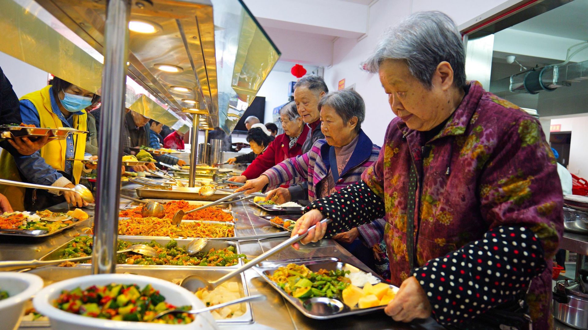 △湖北恩施一社區(qū)“幸福食堂”里,社區(qū)老人、退休職工在排隊(duì)取餐。