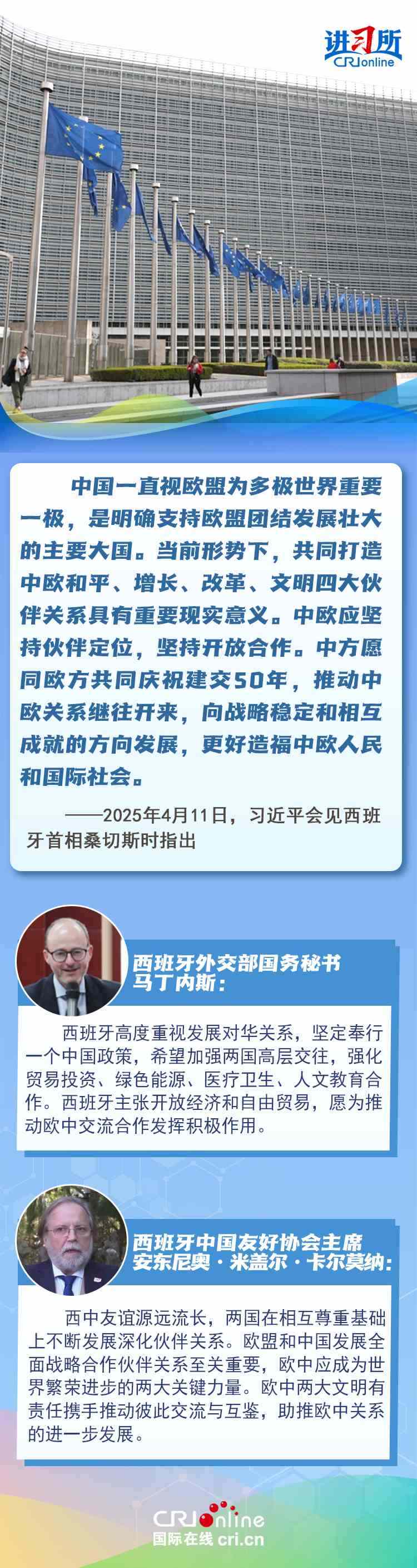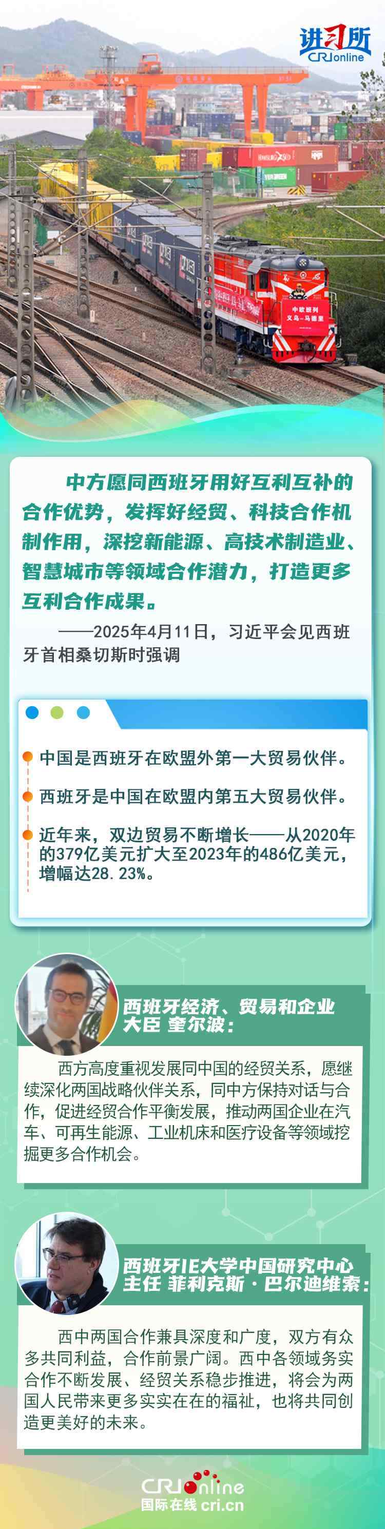 今年是中西全面戰(zhàn)略伙伴關(guān)系建立20周年,也是中歐建交50周年。多年來,中西兩國領(lǐng)導(dǎo)人保持密切互動(dòng),秉持互尊互信、互利共贏精神,兩國在深化貿(mào)易、投資、科技創(chuàng)新、綠色能源等領(lǐng)域取得豐富合作成果,雙邊關(guān)系走在中國同歐洲國家關(guān)系前列。在西班牙人士眼中,良好的對(duì)華關(guān)系對(duì)西班牙、歐洲和世界具有重要意義,將會(huì)為兩國人民帶來更多實(shí)實(shí)在在的福祉,也將共同創(chuàng)造更美好的未來。