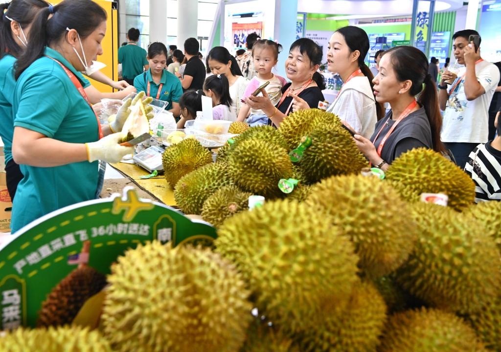 2024年9月28日,觀眾在中國-東盟博覽會(huì)上挑選馬來西亞榴蓮。新華社記者周華攝