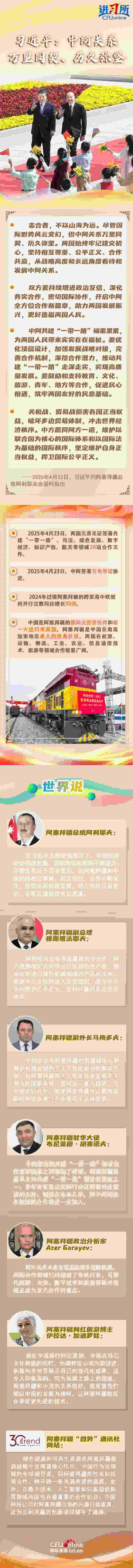4月23日,中國國家主席習(xí)近平在北京同阿塞拜疆總統(tǒng)阿利耶夫舉行會談。兩國元首宣布,建立中阿全面戰(zhàn)略伙伴關(guān)系。習(xí)近平指出,盡管國際形勢風(fēng)云變幻,但中阿關(guān)系萬里同契、歷久彌堅(jiān)。雙方要持續(xù)增進(jìn)政治互信,深化務(wù)實(shí)合作,密切國際協(xié)作,開啟中阿全方位合作新篇章,助力兩國發(fā)展振興,更好造福兩國人民。