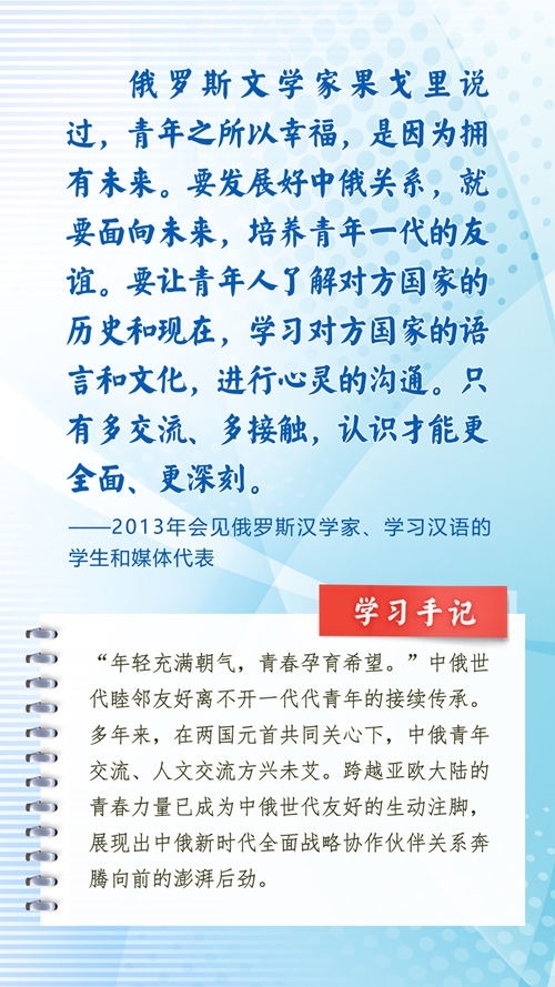 中華民族和俄羅斯民族都有悠久的歷史、古老的文明、燦爛的文化,都是偉大的民族。近年來,習近平主席常常引用中國詩詞古語、俄羅斯諺語名言等,寄語中俄關系發(fā)展和全人類和平與發(fā)展。這些重要論述,蘊含對文明、歷史的深邃思考,指引著新時代的中俄關系不斷向前,為世界百年變局中的人類文明進步事業(yè)指明方向。