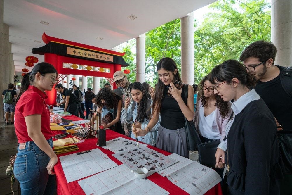 △2025年4月,在巴西里約熱內(nèi)盧天主教大學舉辦的“國際中文日”慶?;顒由希瑢W生們體驗中文書法。