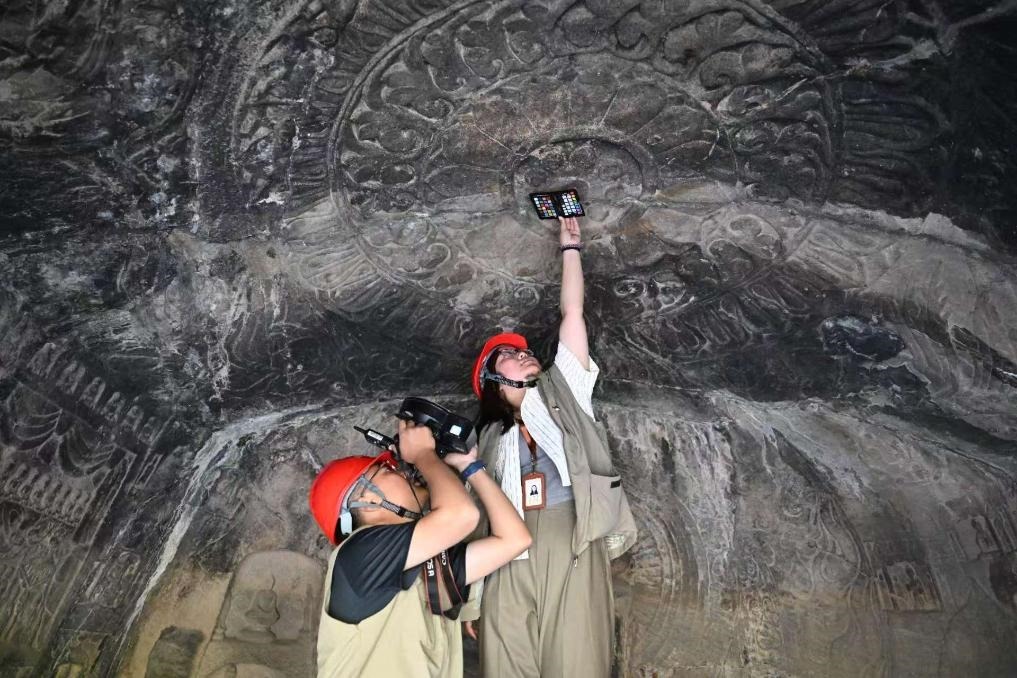 4月10日,龍門石窟研究院工作人員(右)與武漢大學(xué)文化遺產(chǎn)智能計算實(shí)驗(yàn)室團(tuán)隊成員一同對龍門石窟魏字洞進(jìn)行高清攝影掃描。新華社記者 李嘉南 攝