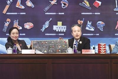 12月30日,北京冬奧組委召開市場(chǎng)開發(fā)、物流和注冊(cè)工作新聞發(fā)布會(huì)。圖為北京冬奧組委市場(chǎng)開發(fā)部部長(zhǎng)樸學(xué)東(右)現(xiàn)場(chǎng)展示北京冬奧會(huì)特許商品。 新京報(bào)記者 陶冉 攝