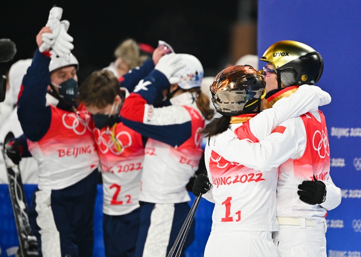 2月10日,賈宗洋(右)與徐夢(mèng)桃賽后擁抱,美國隊(duì)在他們身后慶祝奪冠。新華社記者朱崢攝