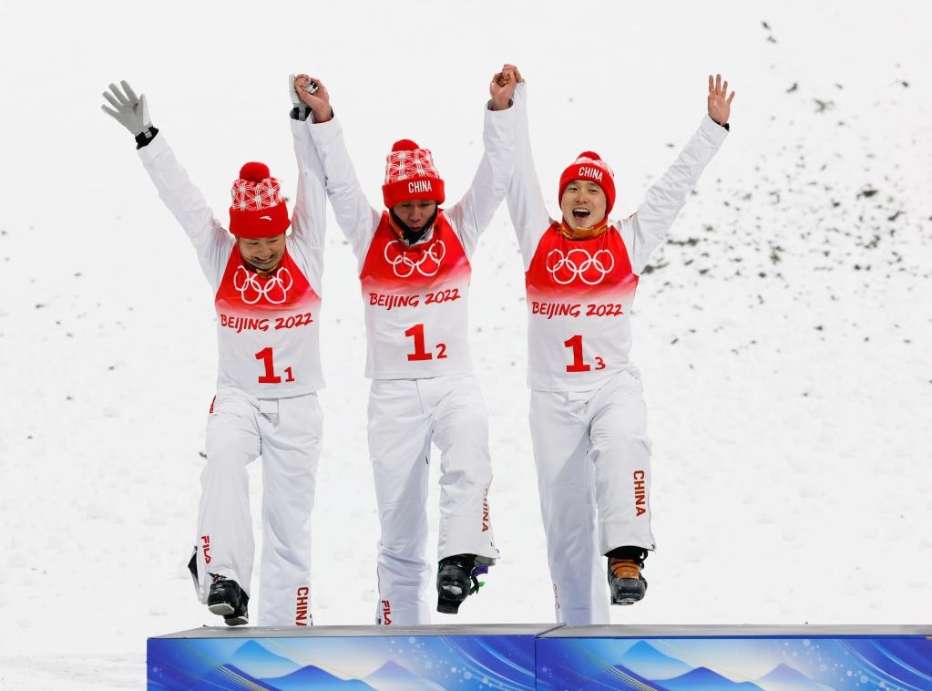 2月10日,亞軍中國隊(duì)選手徐夢(mèng)桃、賈宗洋和齊廣璞(從左至右)在頒發(fā)紀(jì)念品儀式上。新華社記者費(fèi)茂華攝