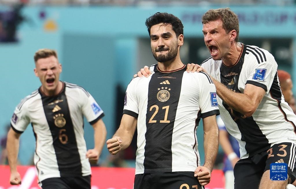 11月23日,德國隊球員伊爾凱·京多安(中)進球后慶祝。新華社記者 潘昱龍 攝