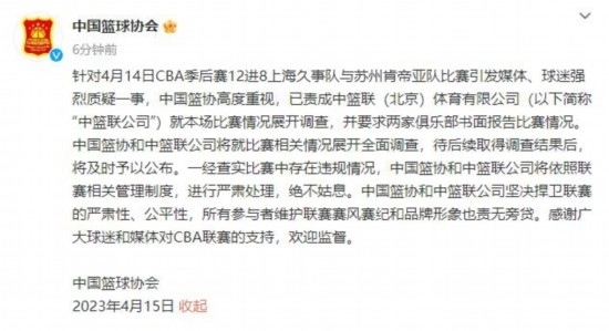 CBA聯(lián)賽官方微博15日凌晨發(fā)布消息表示:針對(duì)4月14日2022-2023賽季CBA聯(lián)賽季后賽12進(jìn)8、上海久事隊(duì)與蘇州肯帝亞隊(duì)比賽引發(fā)媒體、球迷強(qiáng)烈質(zhì)疑一事,中籃聯(lián)(北京)體育有限公司(以下簡(jiǎn)稱(chēng)“中籃聯(lián)公司”)高度重視,已就本場(chǎng)比賽情況展開(kāi)調(diào)查,中國(guó)籃協(xié)也在第一時(shí)間責(zé)成中籃聯(lián)公司查明情況。中籃聯(lián)公司待后續(xù)取得調(diào)查結(jié)果后,將及時(shí)予以發(fā)布。