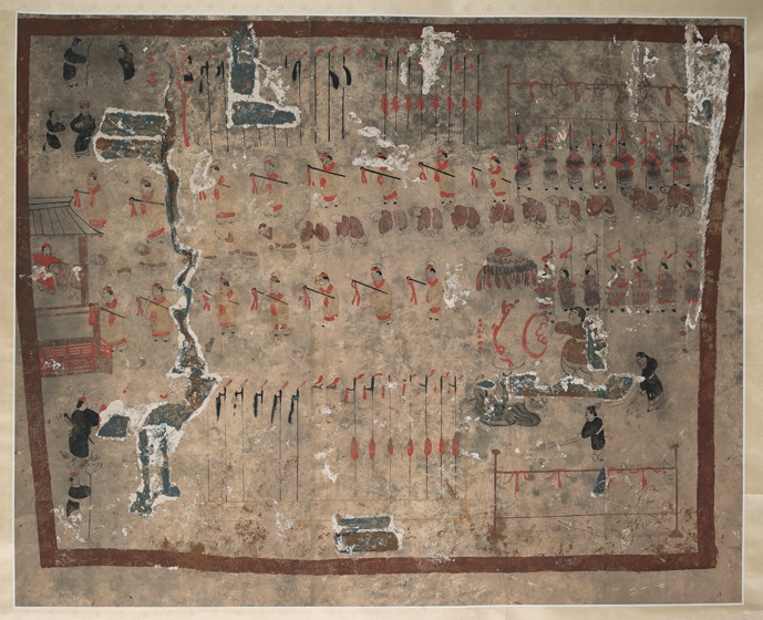 他,眼神堅定,峨冠博帶,身著華服位于畫面中央,周圍有疾馳的駿馬、彪悍的武士、精彩奇絕的樂舞百戲……這些畫面看上去遙遠而陌生。